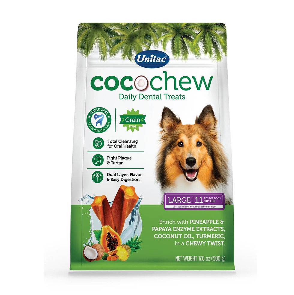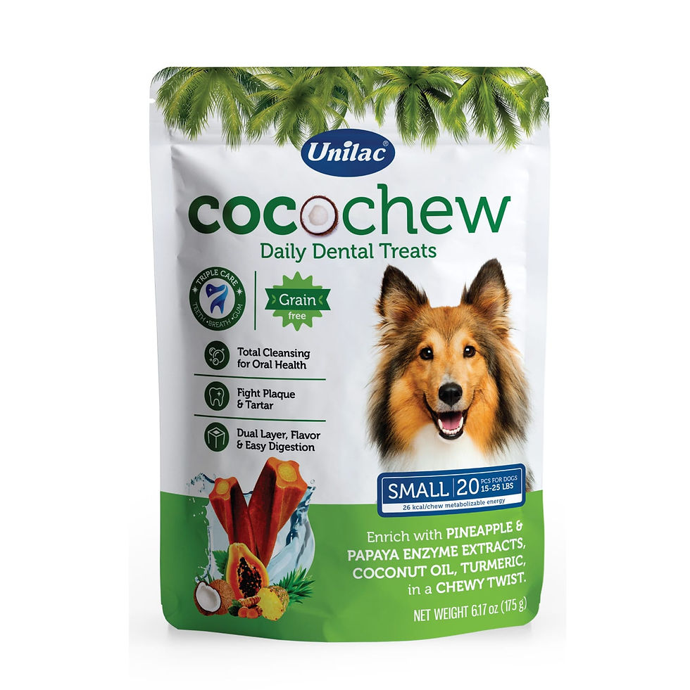 Carefully crafted cocochew daily dental treats come in three sizes of SMALL, MEDIUM, and LARGE to fit the needs of dogs of different sizes.